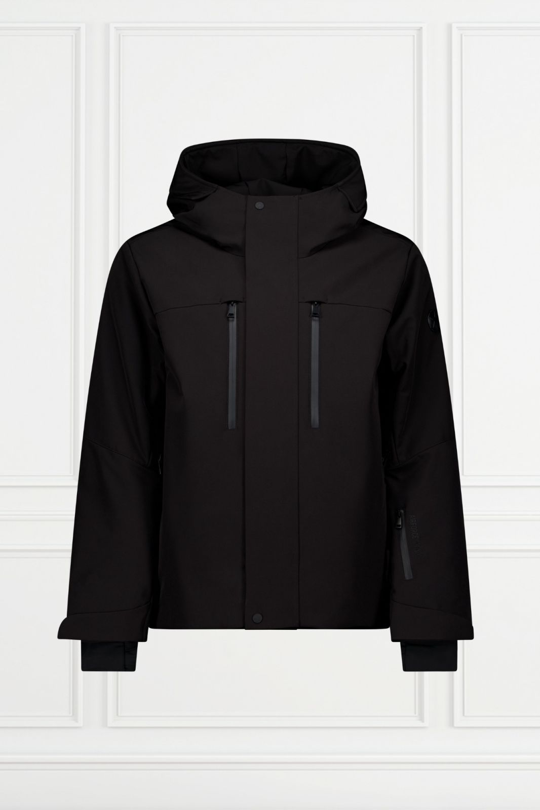 De Bruke Mountain Jacket is windproof en water-repellent. De capuchon kan niet worden verwijderd, maar is aan de achterkant verstelbaar voor een optimale pasvorm. De jas heeft twee binnenzakken met rits en een sneeuwvanger. Aan de buitenzijde bevinden zich twee borstzakken met waterdichte ritsen, twee zijzakken met verborgen ritsen en een skipasvakje op de linkermouw, met daarboven het Air-Force wording-logo. Op de linkerschouder is een zwarte logobadge geplaatst. De jas heeft verstelbare manchetten met klittenband, ingebouwde windstoppers met duimgaten en ventilatieritsen die lopen van de bovenarm tot onder de borst voor extra comfort tijdens het skiën. De Bruke Mountain Jacket sluit met een waterdichte rits, afgedekt door een flap met drukknopen en klittenband.