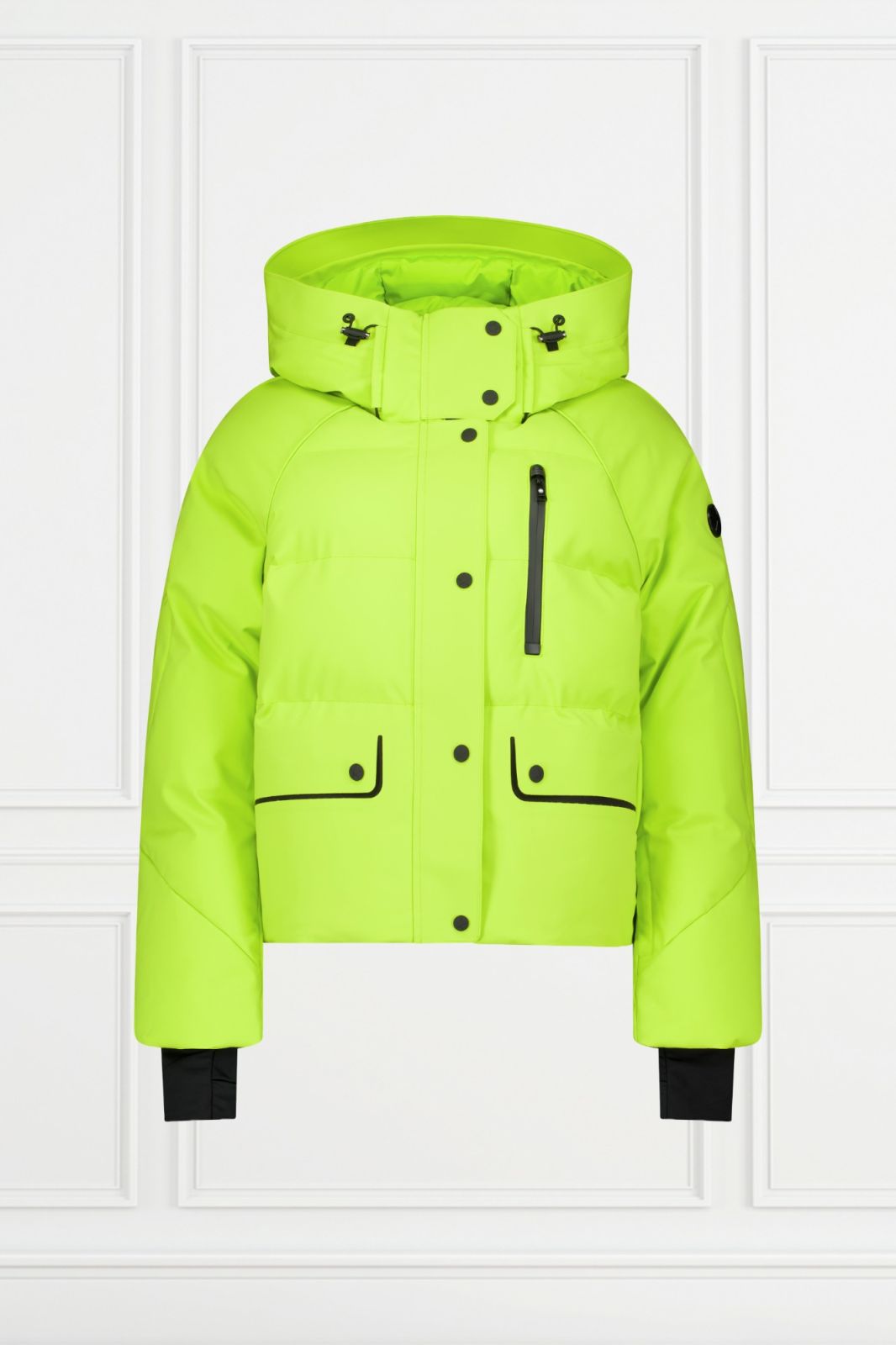 De manchetten zijn verstelbaar met klittenband en voorzien van duimgaten. Binnenin zit een sneeuwvanger en twee binnenzakken met ritssluiting. De jas is windproof, waterafstotend en uitgevoerd in een matte stof met een metalen logobadge op de mouw.