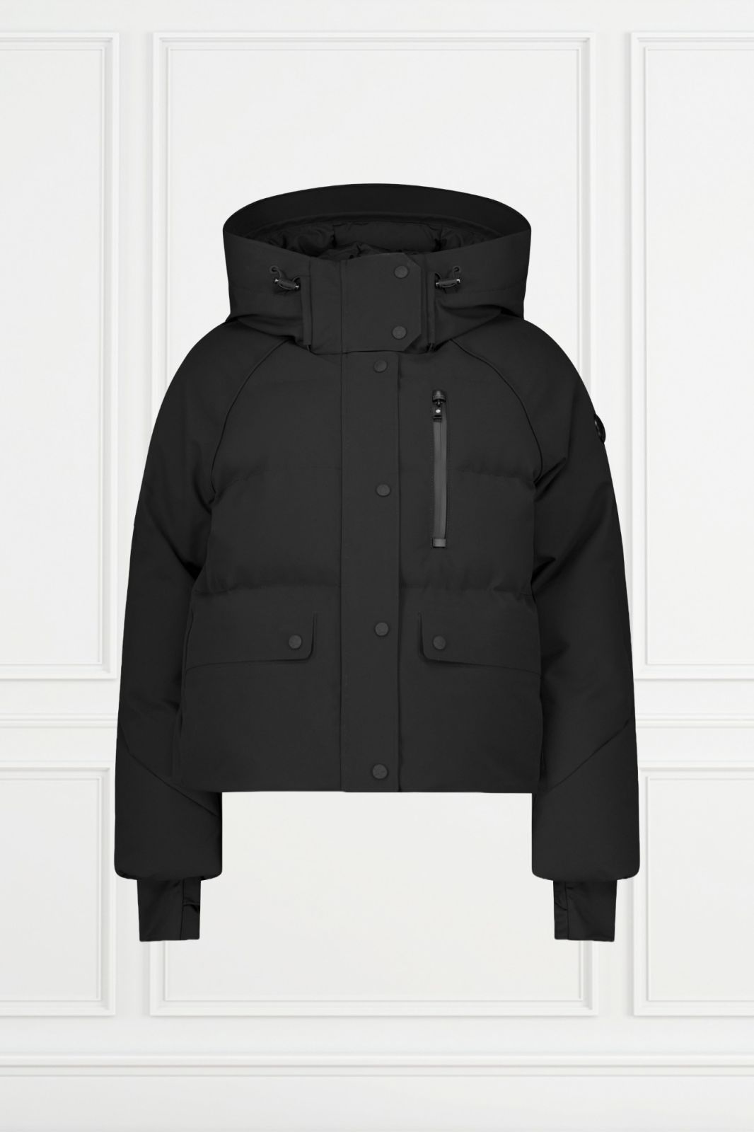 De manchetten zijn verstelbaar met klittenband en voorzien van duimgaten. Binnenin zit een sneeuwvanger en twee binnenzakken met ritssluiting. De jas is windproof, waterafstotend en uitgevoerd in een matte stof met een metalen logobadge op de mouw.