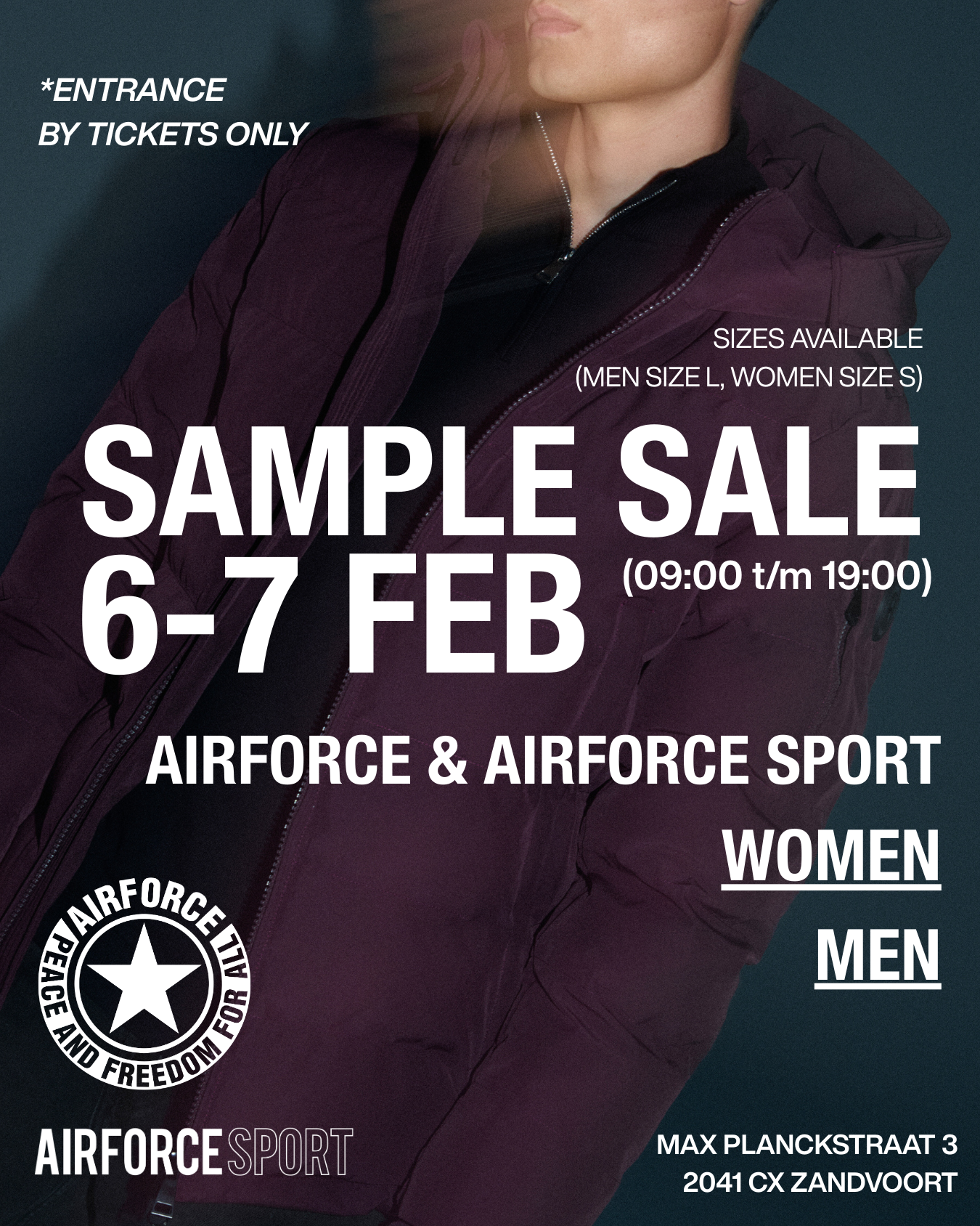 SAMPLE SALE AIRFORCE & AIRFORCE SPORT vrijdag 6 & 7 februari 09:00 uur t/m 19:00 uur Alleen toegang met een ticket van jouw tijdslot. Locatie: Max Planckstraat 3, 2041 CX, Zandvoort. Beschikbare collecties: AIRFORCE: dames (maat S) & heren (maat L). AIRFORCE SPORT: dames (maat S) & heren (maat L). - er worden geen grote tassen toegelaten Toegangstickets: WEES SNEL: PER TIJDSLOT IS SLECHT EEN BEPERKT AANTAL TICKETS BESCHIKBAAR KLIK HIER OM JOUW TICKETS TE BESTELLEN Voor vragen kunt u contact opnemen via onze chat, Whatsapp of bellen naar 0888802488 of mailen naar info@air-force.nl |