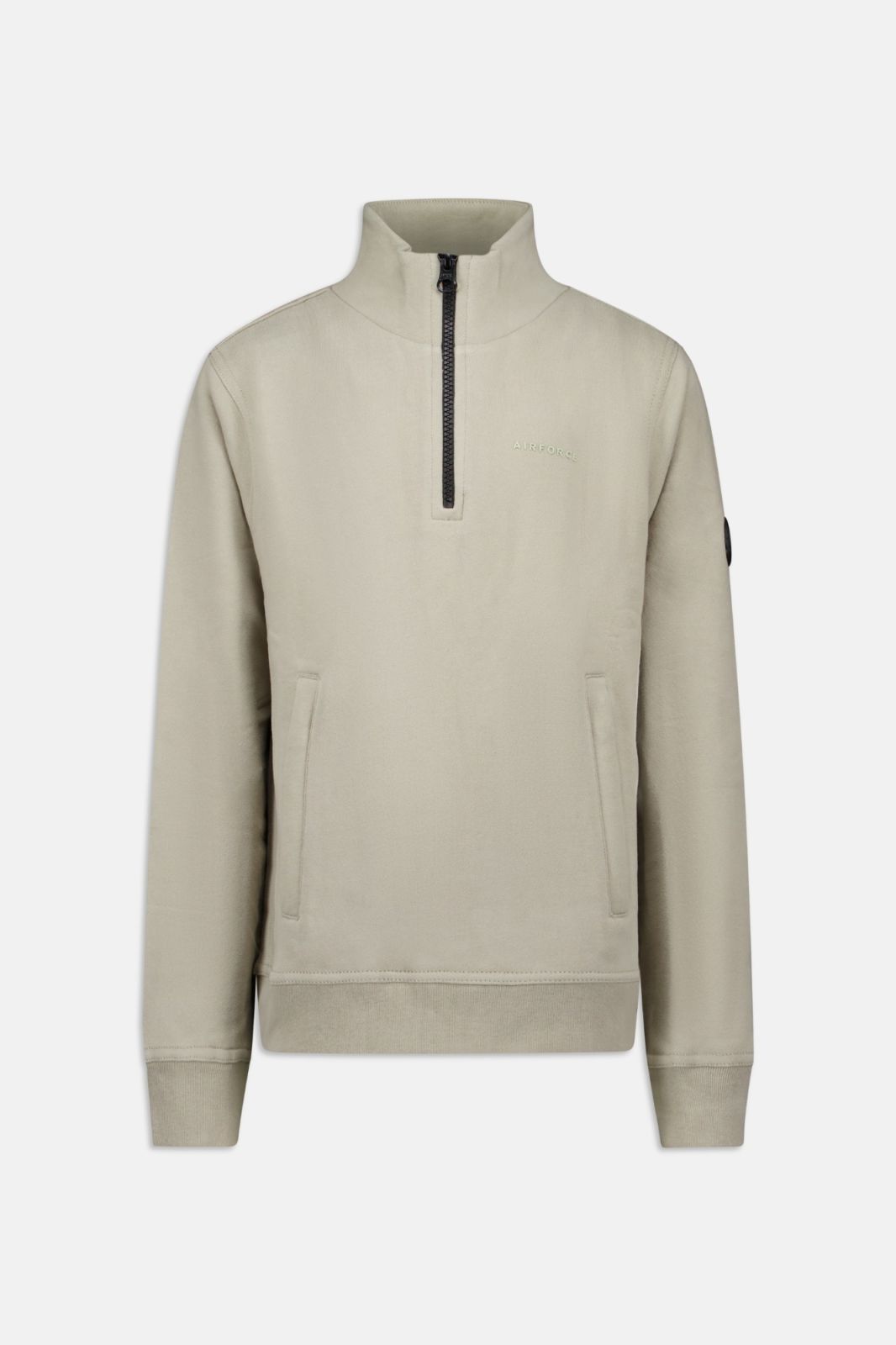 De Sweat Quarter Zip heeft een hoge zwarte ritssluiting. Op de linkerborst zit een rubberen 3D Air-Force wording logo en op de linkermouw een zwarte Air-Force logo badge. De trui heeft twee zakken die sluiten met een rits, en de boorden aan de onderkant van de trui en mouwen zorgen voor een goede pasvorm.