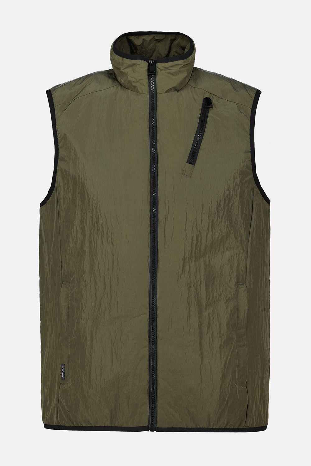 Maak je outfit af met deze comfortabele bodywarmer van waxed crinkle materiaal, ook ideaal voor de koudere zomerdagen. Op de linker borst zit een zak met diagonale ritssluiting. De bodywarmer heeft een hoge kraag met ritssluiting en is voorzien van 2 steekzakken die af te sluiten zijn met rits. Het model is 1.86m lang en draagt maat L.